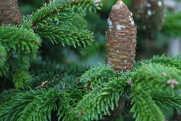 Measuring up to 2 metres in diameter, the straight trunk is smooth and grey with resinous blisters, bearing horizontal boughs that curve upward at their outer extremities. The flat, needle-like leaves are dark green above with two white lines beneath, and when seen from below the tree appears to have a silvery colour; hence its common name. Silver fir essential oil is extracted from these leaves.