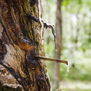 Copaiba trees are found mainly in tropical South America. They reach 15-30 metres in height, branching out only at the top, and producing leathery leaves, small white flowers and fruit pods containing 2-4 seeds. The trees produce a sticky substance called oleoresin. This is harvested by tapping or drilling holes into the tree trunk. The resin that is collected is then steam distilled to extract Copaiba essential oil. A single tree can produce approximately 40 litres of essential oil per year, offering a sustainable rainforest resource that can be harvested without harming the tree or its environment.